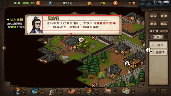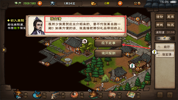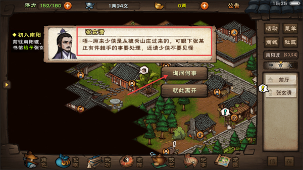 1、與【張玄清】對話時選擇詢問何事,開啟他提及的棘手任務(wù),推進(jìn)初入南陽的劇情流程。