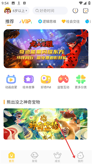 1、在包含【動(dòng)畫(huà)啟蒙】【繪本故事】等分類的首頁(yè)界面,點(diǎn)擊底部導(dǎo)航欄的【我的】選項(xiàng),可進(jìn)入個(gè)人中心頁(yè)面。