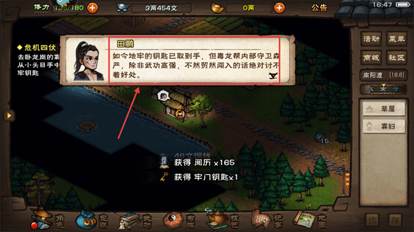 1、已獲取【地牢鑰匙】,但【毒龍幫】內(nèi)部守衛(wèi)森嚴,若無高強武功,貿(mào)然闖入難有好處,需另尋潛入方法。