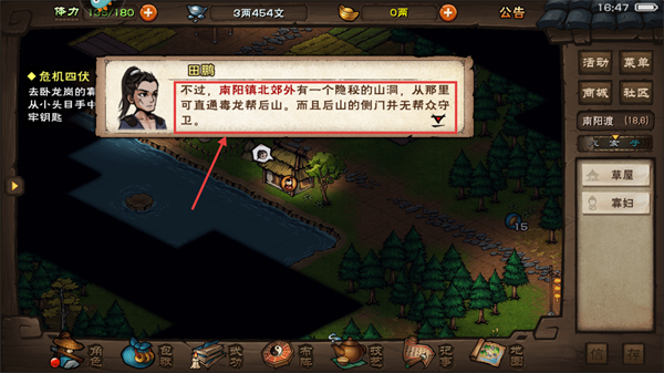 2、【南陽鎮(zhèn)】北郊外有隱秘山洞,可直通【毒龍幫】后山,后山側(cè)門無幫眾守衛(wèi),可從此處潛入。
