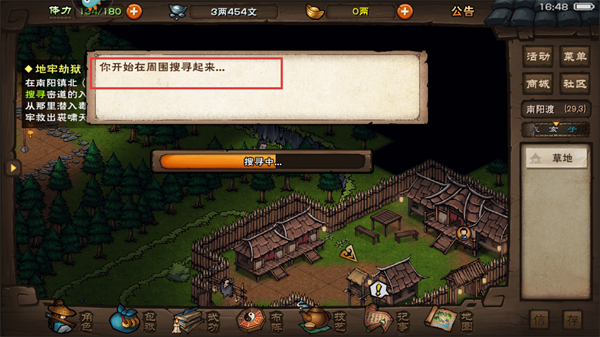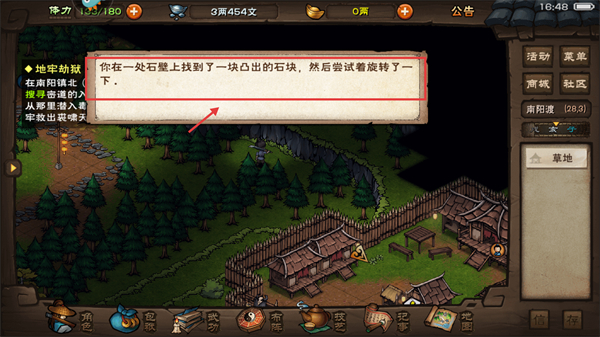 3、在【南陽鎮(zhèn)】北區(qū)域搜尋密道入口,按提示進行搜尋操作,逐步接近潛入【毒龍幫】地牢的路徑。