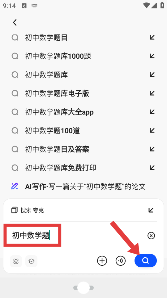 3、以【初中數學題】為例,輸入后點擊搜索框右側【藍色放大鏡】圖標。