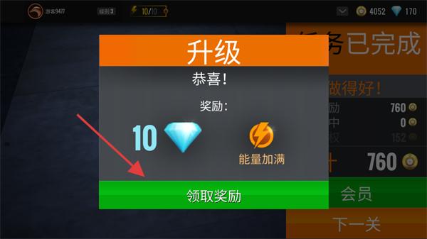 1、點擊【領取獎勵】按鈕,獲取【10鉆石】與【能量加滿】的升級獎勵,補充游戲資源。