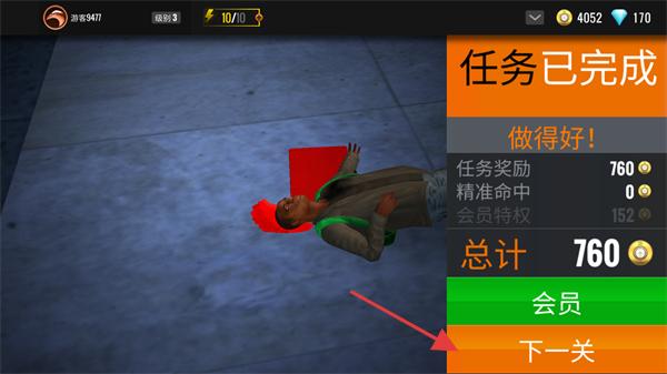 4、任務完成后領取總計【1040】金幣獎勵,點擊下一關可繼續挑戰新的狙擊任務,提升狙擊技能等級。