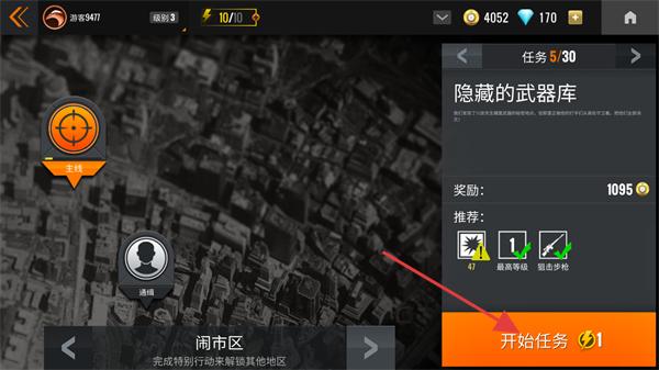 3、消耗【1點能量】點擊【開始任務】按鈕,接取【隱藏的武器庫】任務,準備執行新挑戰。