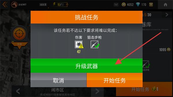 4、觸發【挑戰任務】彈窗,若武器不達標可點擊【升級武器】,或直接點【開始任務】推進。