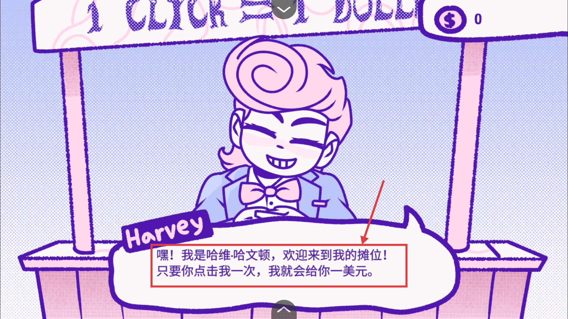 3、遇到角色【Harvey】,點擊該角色可獲得金錢,初期反復點擊能快速積累初始資金,助力后續進展。
