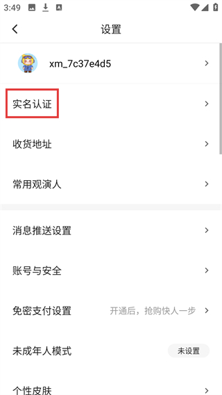 3、在設(shè)置頁面的選項列表里,找到【實名認(rèn)證】這一項并點擊,進(jìn)入實名認(rèn)證的操作界面。