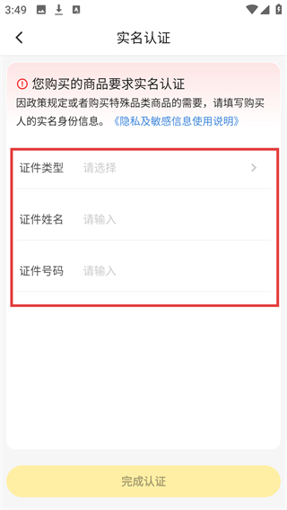 4、在實名認(rèn)證頁面,依次選擇【證件類型】、輸入【證件姓名】和【證件號碼】,完成后即可提交認(rèn)證。