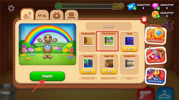 2、打開裝飾界面選擇【Fancy-Meadow】場景,點(diǎn)擊【Apply】按鈕應(yīng)用,更換木偶人的所處環(huán)境。