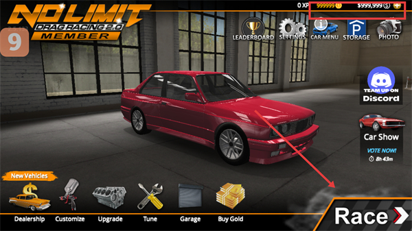 1、點擊【Race】進入比賽場景,利用豐富的金幣和現金資源,為賽車競速做準備。