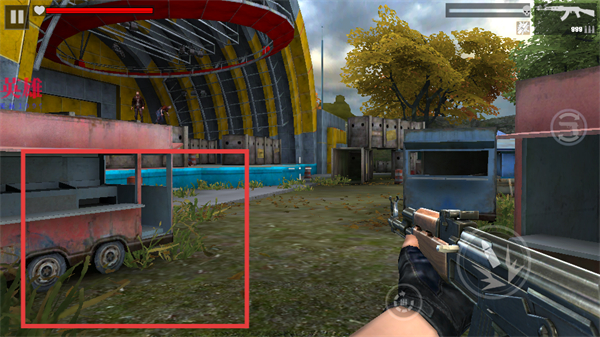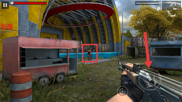 2、進入游戲場景后,觀察周圍環境(如廢棄餐車),尋找僵尸目標,準備射擊。