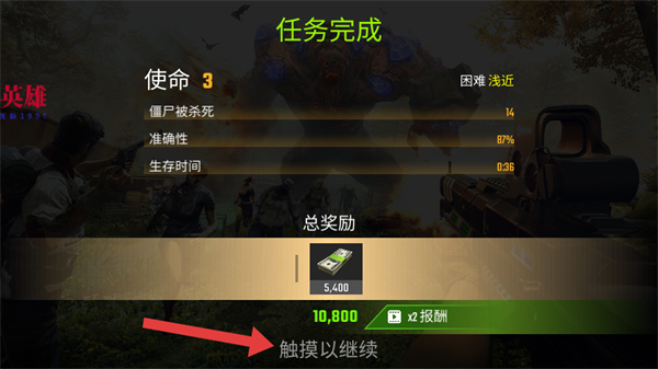 4、任務完成后,觸摸屏幕繼續,獲取任務獎勵,用于后續武器升級和任務挑戰。