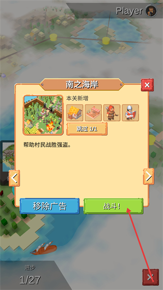 2、【南之海岸】關(guān)卡詳情頁目標(biāo)為幫助村民戰(zhàn)勝?gòu)?qiáng)盜,點(diǎn)擊紅箭頭指向的【戰(zhàn)斗!】按鈕開啟該關(guān)卡戰(zhàn)斗。