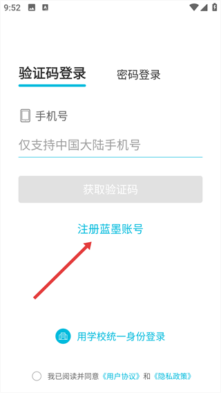 1、在驗(yàn)證碼登錄界面點(diǎn)擊【注冊(cè)藍(lán)墨賬號(hào)】選項(xiàng)。