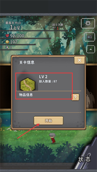 1、進入【LV2】關卡前查看敵人數量與物品信息,確認狀態后點擊【開始】按鈕進入戰斗。