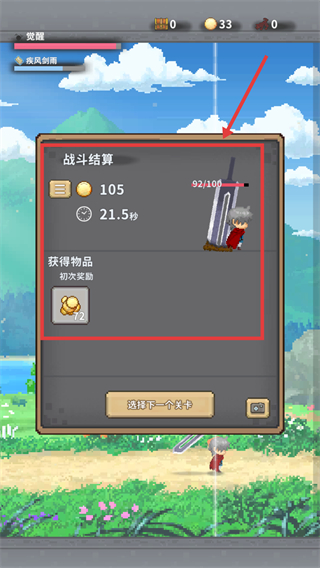 4、戰斗結束后查看結算界面,獲取金幣與物品獎勵點擊【選擇下一個關卡】繼續挑戰新關卡。