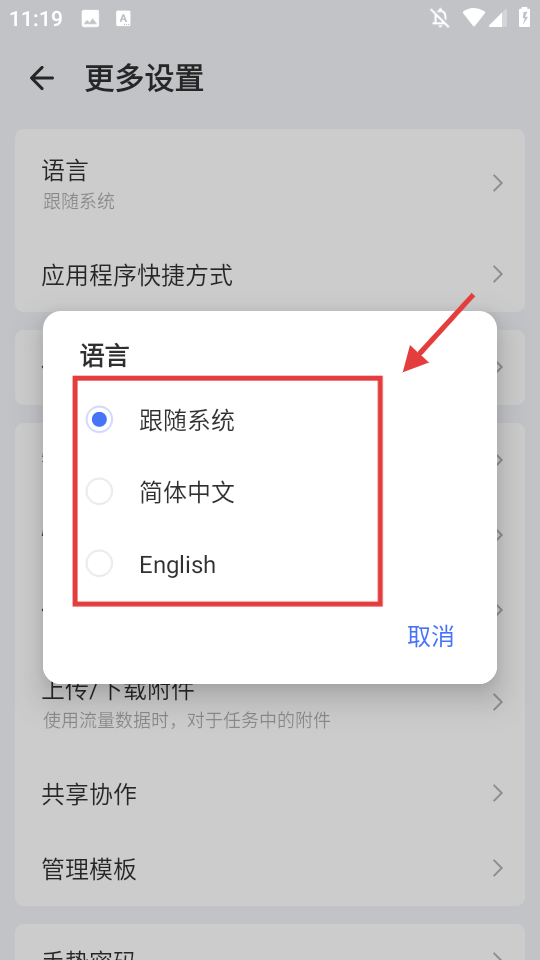 4、選擇目標語言(如簡體中文、English或跟隨系統),完成語言設置修改。