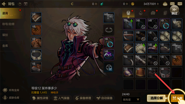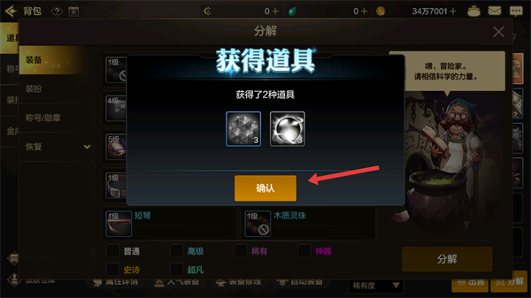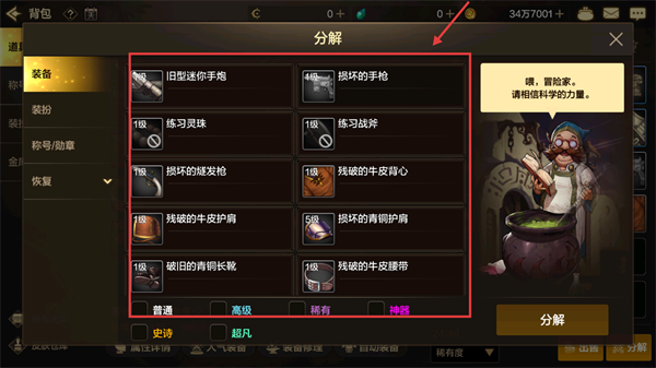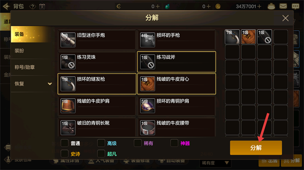 1、在背包界面點擊【分解】,進入裝備分解界面。