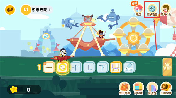 1、在識字啟蒙主界面,點擊右上角的【家長設(shè)置】按鈕。