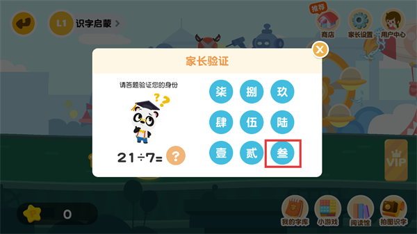 2、點擊【家長設(shè)置】后彈出【家長驗證】彈窗,題目為21÷7=?,選擇對應(yīng)的【叁】選項即可完成身份驗證。