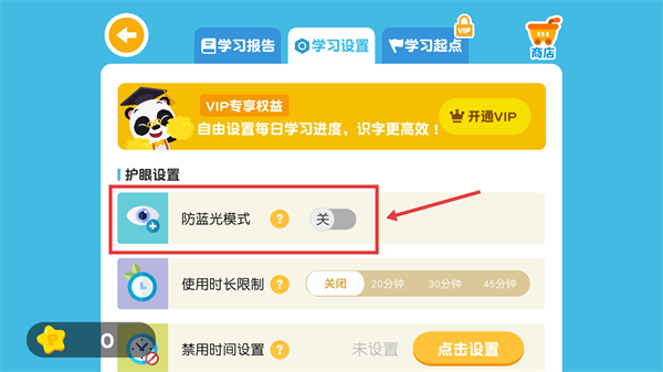 4、在【學(xué)習(xí)設(shè)置】的【護眼設(shè)置】板塊,找到【防藍(lán)光模式】開關(guān),當(dāng)前該開關(guān)處于【關(guān)】的狀態(tài),可點擊切換開啟。
