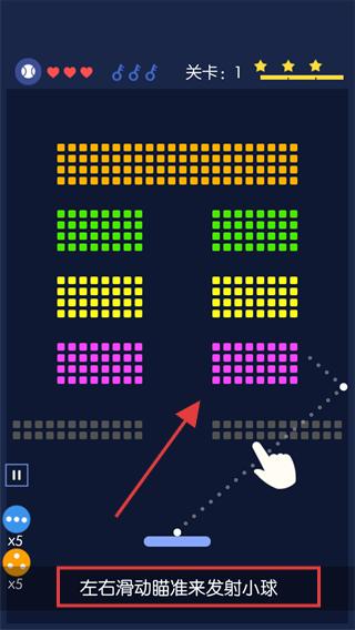1、滑動底部【瞄準器】調整角度,發射小球擊碎上方彩色磚塊,同色小球優先擊碎對應顏色磚塊。