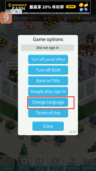 3、在選項界面中點擊【Changelanguage】選項,選擇【中文】語言,完成游戲語言的切換操作。