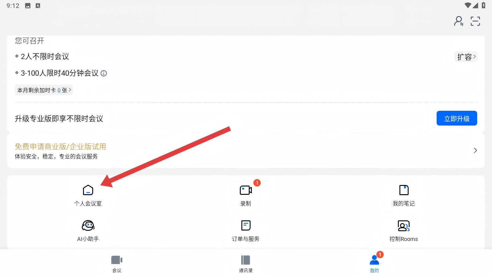 2、在【我的】頁(yè)面里,我們選擇點(diǎn)擊【個(gè)人會(huì)議室】選項(xiàng),去查看或調(diào)整會(huì)議室的各項(xiàng)設(shè)置,為開(kāi)會(huì)做準(zhǔn)備哦。