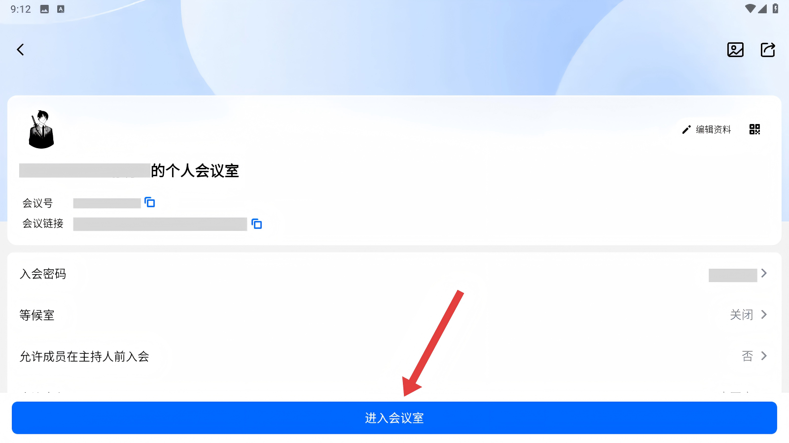 3、進(jìn)入個(gè)人會(huì)議室頁(yè)面后,確認(rèn)會(huì)議號(hào)、入會(huì)密碼等信息,然后點(diǎn)擊底部的【進(jìn)入會(huì)議室】按鈕,就能開(kāi)啟會(huì)議啦。