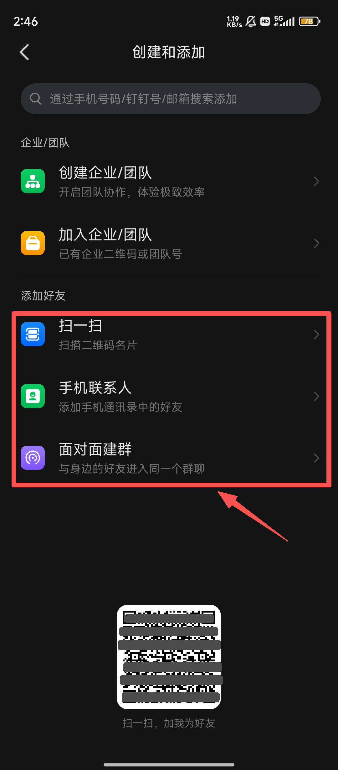 4、在創(chuàng)建和添加頁(yè)面,我們可以選擇【掃一掃】掃描二維碼名片等方式來添加好友呢。