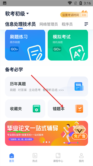 1、進(jìn)入app首頁,在【備考必學(xué)】區(qū)域點(diǎn)擊【錯(cuò)題本】。