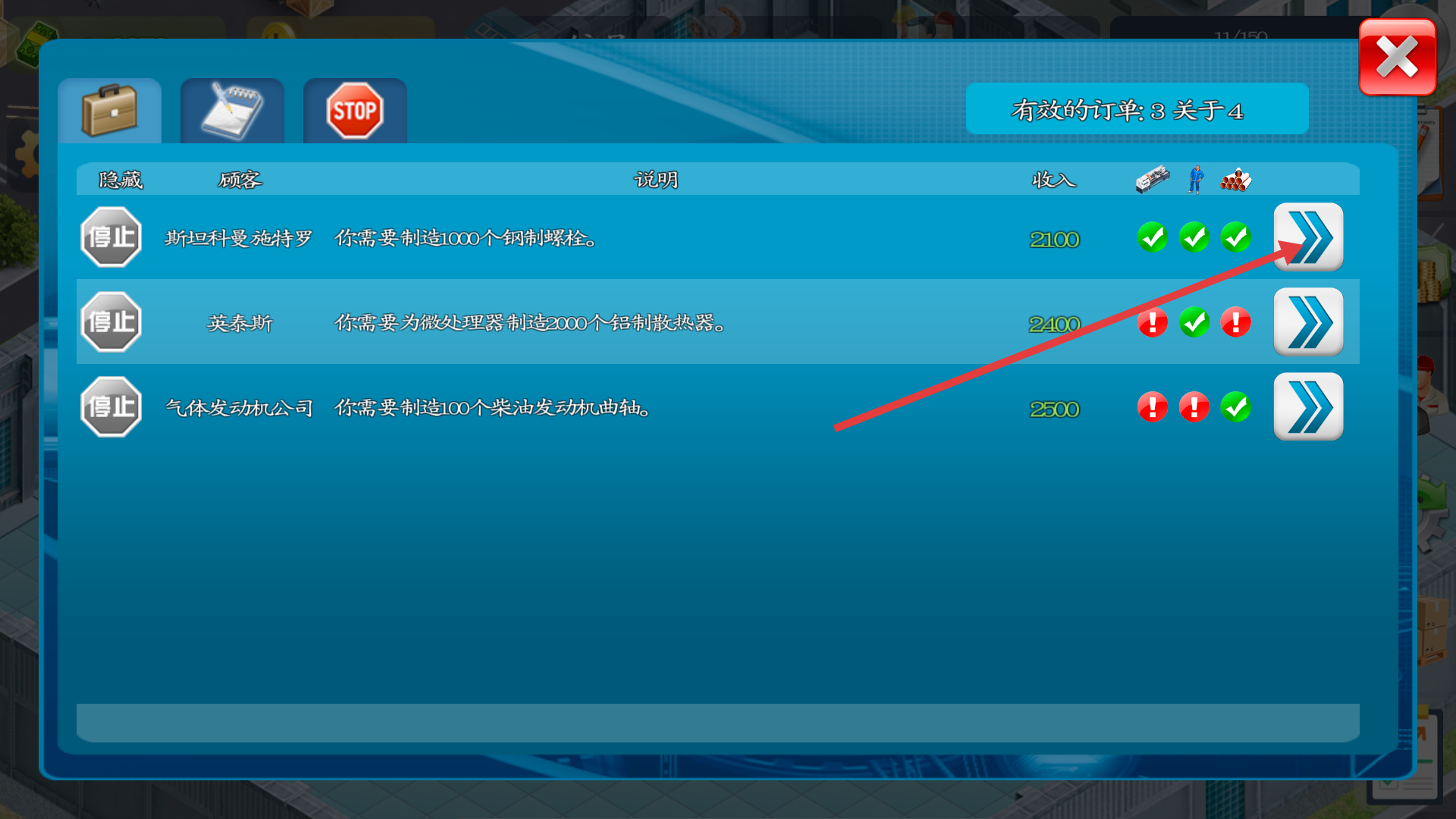 3、點擊紅箭頭指向首個訂單推進按鈕,可查看各訂單完成狀態與收入。