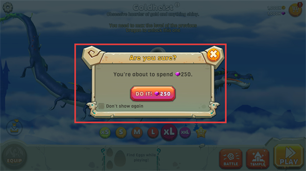 2、確認花費【250-Doit!】中的250寶石時,點擊Doit!按鈕完成操作,推進龍的解鎖或升級流程。
