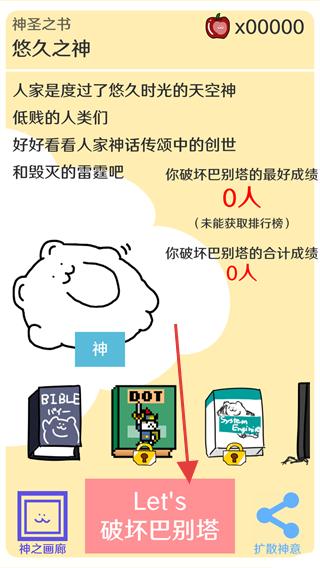 1、點擊【Let's-破壞巴別塔】按鈕開始游戲,初始破壞巴別塔的合計成績為0人。
