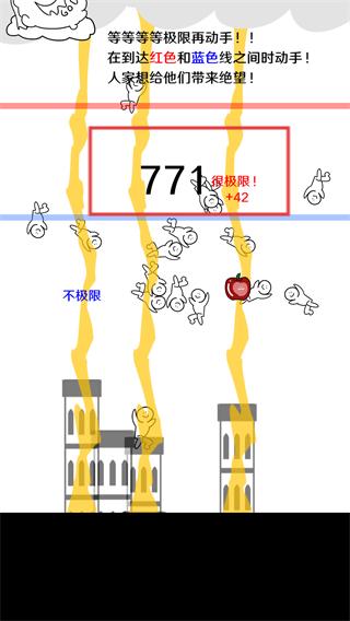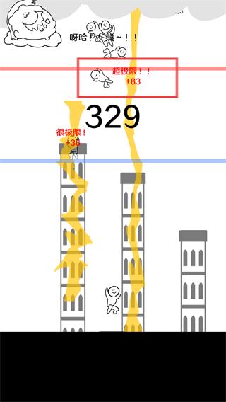 -塔通過紅線時游戲結束。在塔到達藍線前破壞,會導致一段時間內無法落雷。