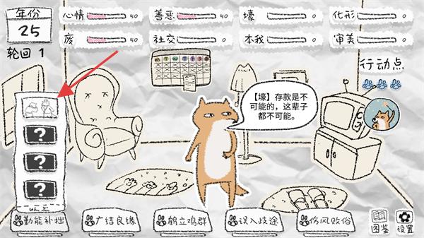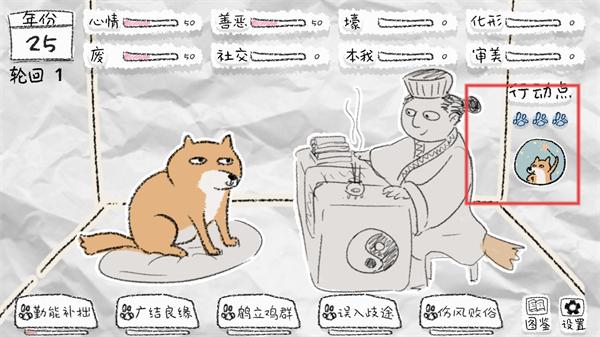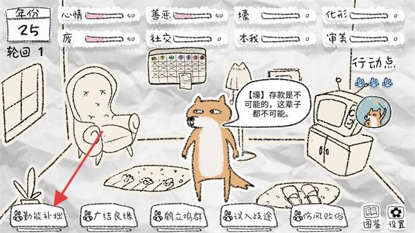 2、進入游戲后查看【年份:25】等屬性,點擊【勤能補拙】等選項消耗行動點,推進養成。