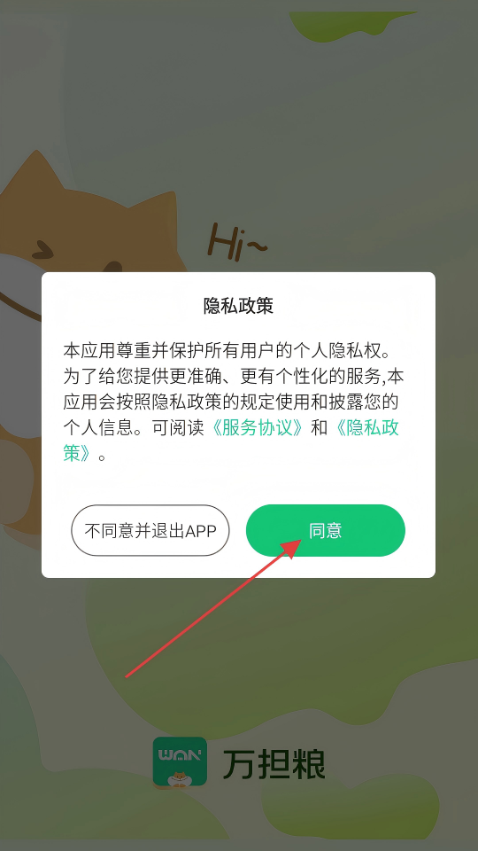 1、打開“萬擔(dān)糧”APP,在“隱私政策”彈窗中,點(diǎn)擊【同意】,進(jìn)入APP主界面。