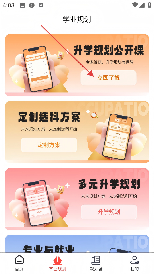 2、在學業規劃頁面點擊“升學規劃公開課”旁的【立即了解】,進入公開課堂頁面。