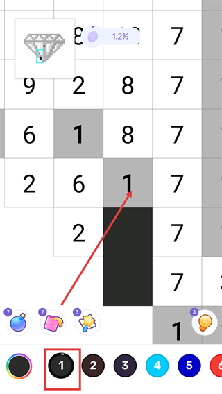 2、選【1號】黑色色塊,沿【紅色箭頭】填充數字1的格子,開始繪制鉆石輪廓。
