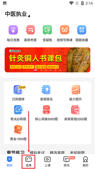 1、進入【中醫執業】板塊界面,可使用題庫相關功能,點擊底部【選課】進入課程選擇頁面。