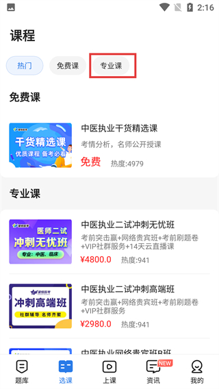 2、在課程頁可切換【熱門】【免費課】【專業課】標簽,點擊選擇【專業課】。
