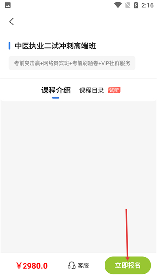 4、進入【中醫執業二試沖刺高端班】詳情頁,可查看課程介紹,點擊【立即報名】完成該課程的報名操作。