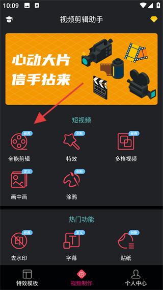 1、進(jìn)入界面,點(diǎn)擊【全能剪輯】功能,進(jìn)入視頻素材選擇頁面。