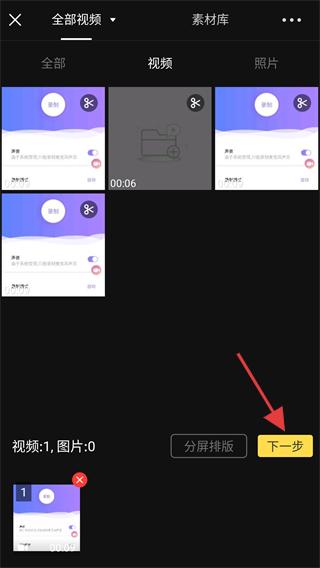 2、在素材頁選中目標(biāo)視頻,點(diǎn)擊【下一步】,進(jìn)入視頻編輯界面。