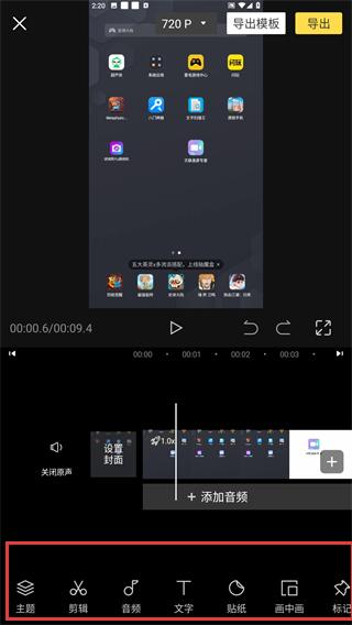 4、切換到剪輯工具欄,用【分割】【轉(zhuǎn)場(chǎng)】等功能細(xì)化剪輯,完成后導(dǎo)出視頻。