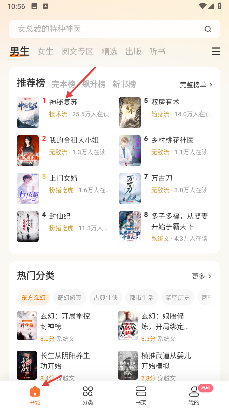 1、在【書城】推薦榜點(diǎn)擊【神秘復(fù)蘇】,進(jìn)入小說閱讀頁。