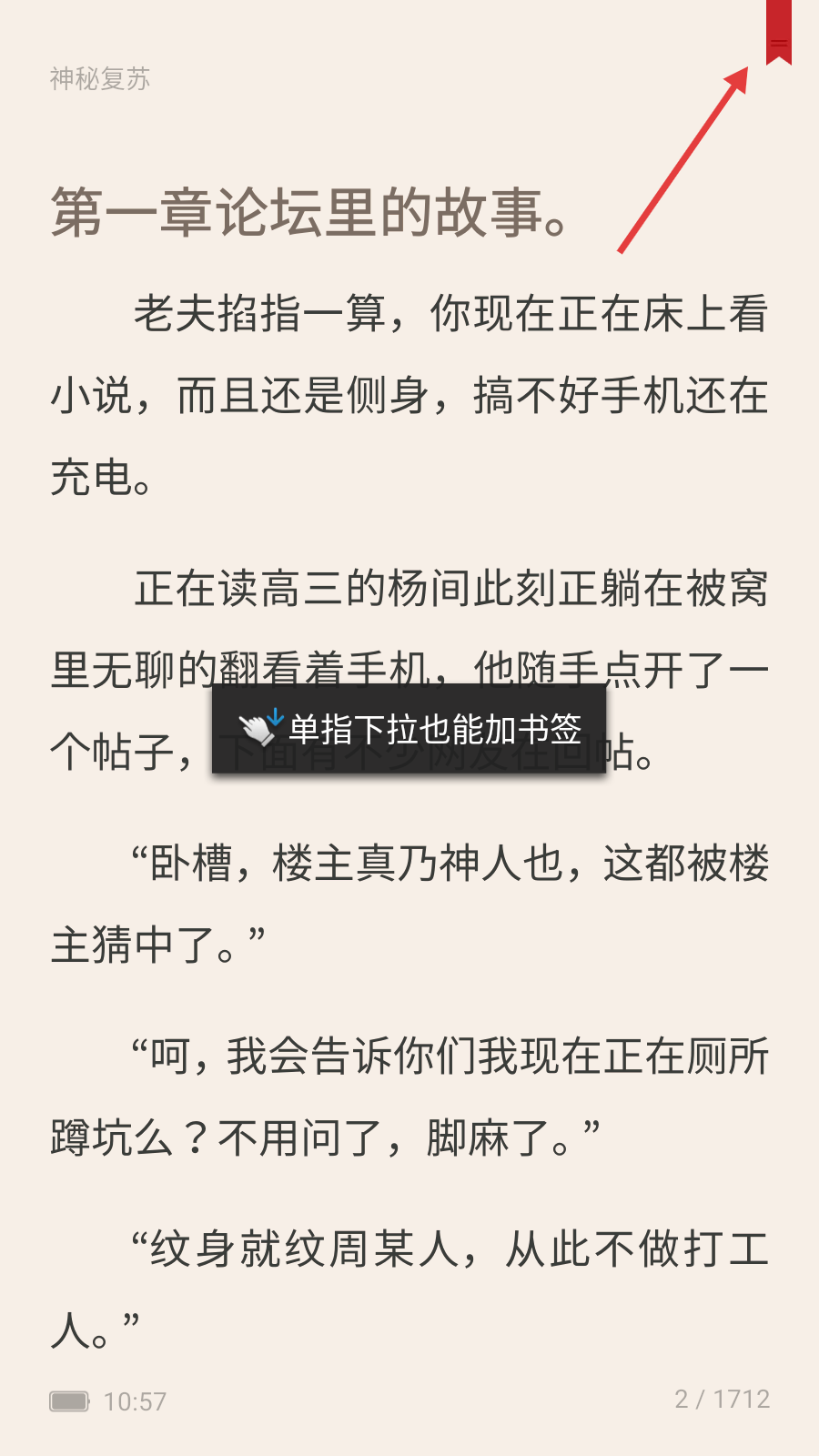 4、可以看到右上角已經(jīng)添加書簽,也可單指下拉頁面右側(cè)紅色書簽條,快速添加書簽。