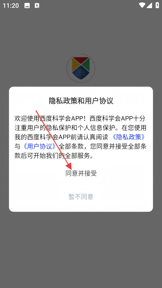 1、點擊【同意并接受】,進入西度科學(xué)會APP。
