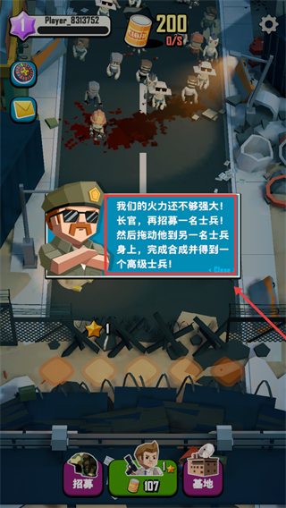3、當(dāng)火力不足時(shí),再招募士兵并拖動到另一名士兵身上,合成高級士兵提升隊(duì)伍整體戰(zhàn)力。